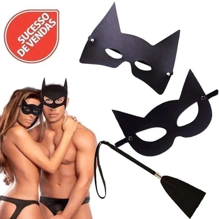 Kit 3 em 1 máscara do Batman e Mulher Gato mais chibata foi criado para noites mais quentes e sensuais, para que você realize suas fantasias e enlouqueça seu (a) parceiro (a) com brincadeiras picantes que irão elevar as sensações e provocar os sentidos, feito especialmente para quem deseja sair da rotina.